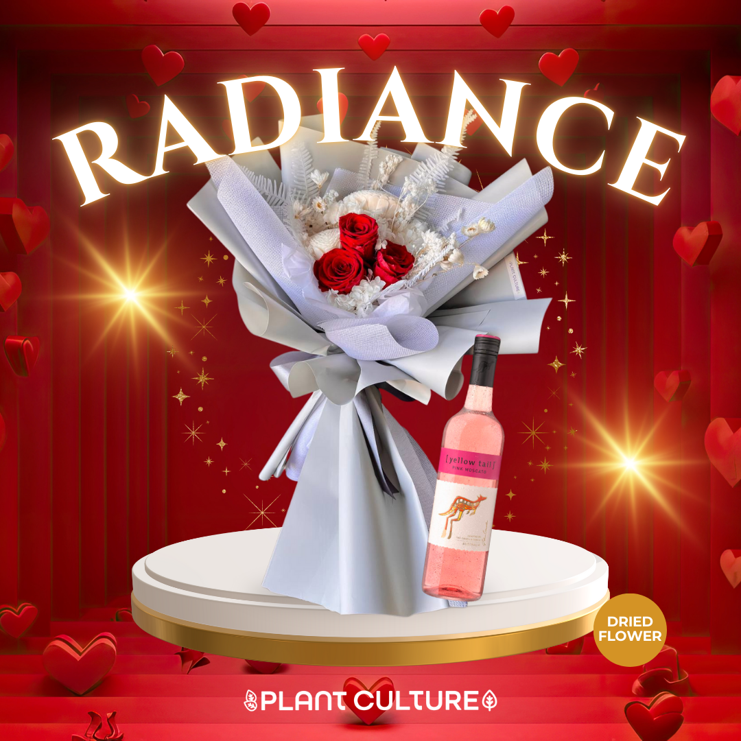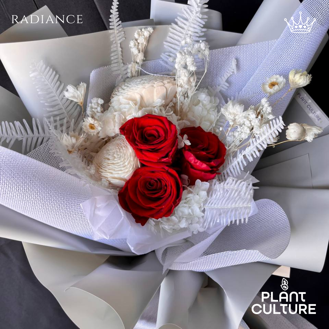 Preserved Red Rose, Sola Flower White, Ruscus White, Hydrangea White