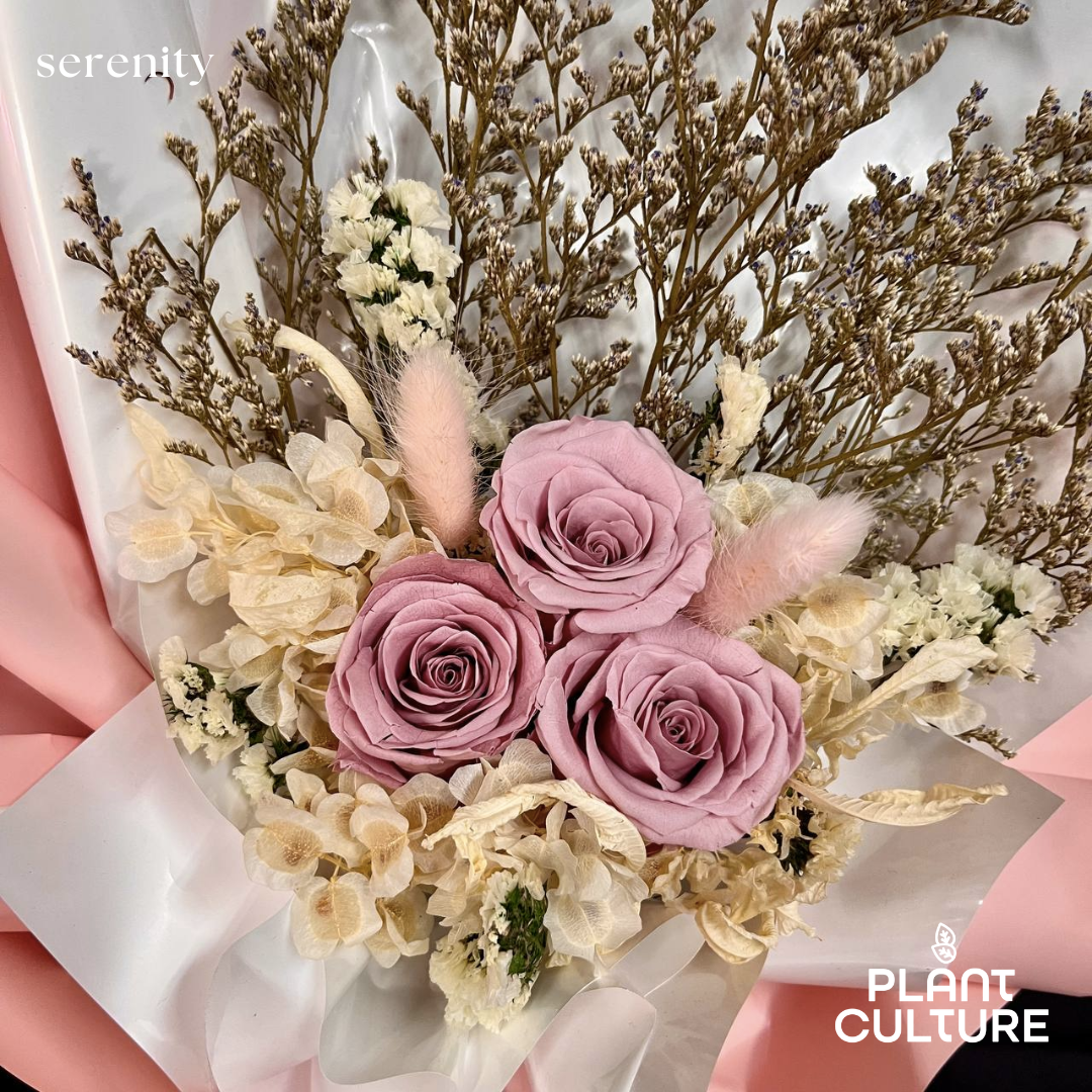 A beautiful assortment of preserved dried flowers composed of Nude Pink Roses paired with light pink bunny tails, white forget me nots, and lovers grass. Arranged so each stem will complement the other in its hue and complexion in the resulting bundle. [ These flowers are real and have been preserved to maintain their color and form. ]